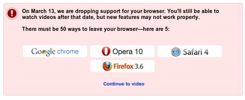Until, today I tried to access YouTube with Firefox 2, and I got this interesting message. Admitedly, it is a nice way to promote Google Chrome browser, but it also shows that Google has even trouble counting to 5. For those of you not looking at the screenshot: the text says “here are 5 ways to leave your browser”, and shows only 4 browsers listed underneath ;)